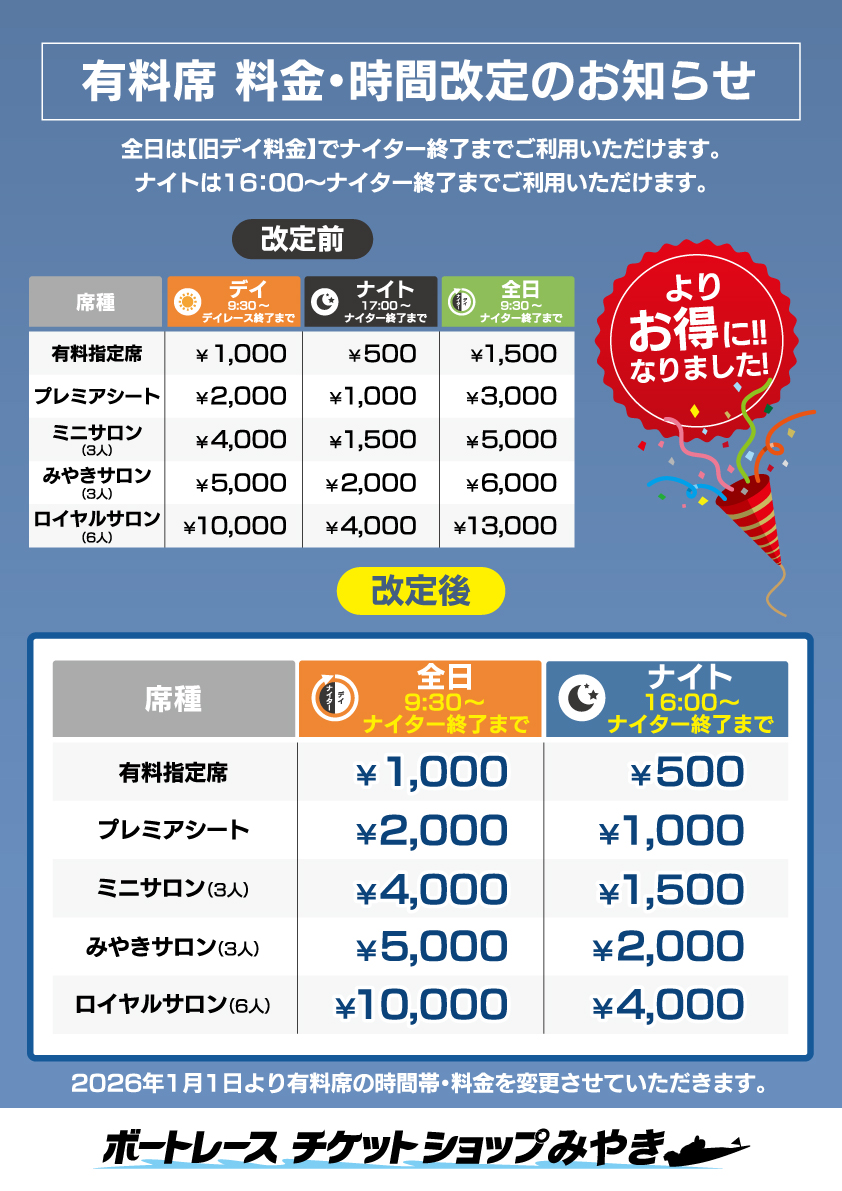 2026年1月1日(木)有料席【料金・ご利用時間】変更のお知らせ