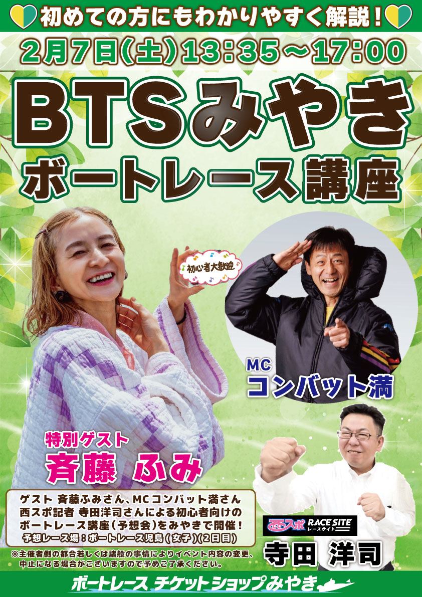2/7(土)ボートレース講座(斉藤ふみ・コンバット満・寺田洋司)開催!!