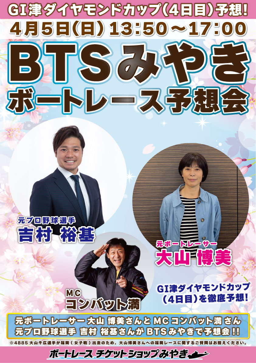 4月5日(日)BTSみやき予想会 13:50~17:00【吉村裕基・大山博美】