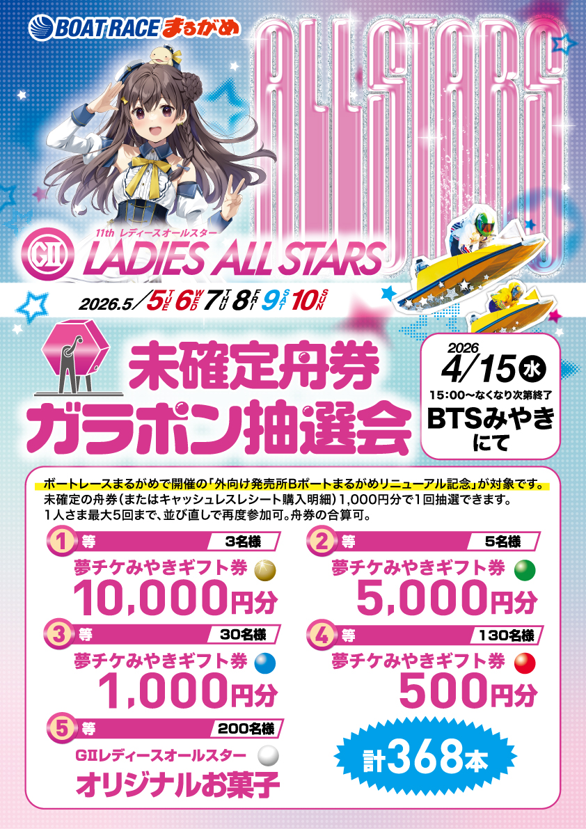 4/15(水)15:00~BR丸亀限定『未確定舟券ガラポン抽選会』開催!!